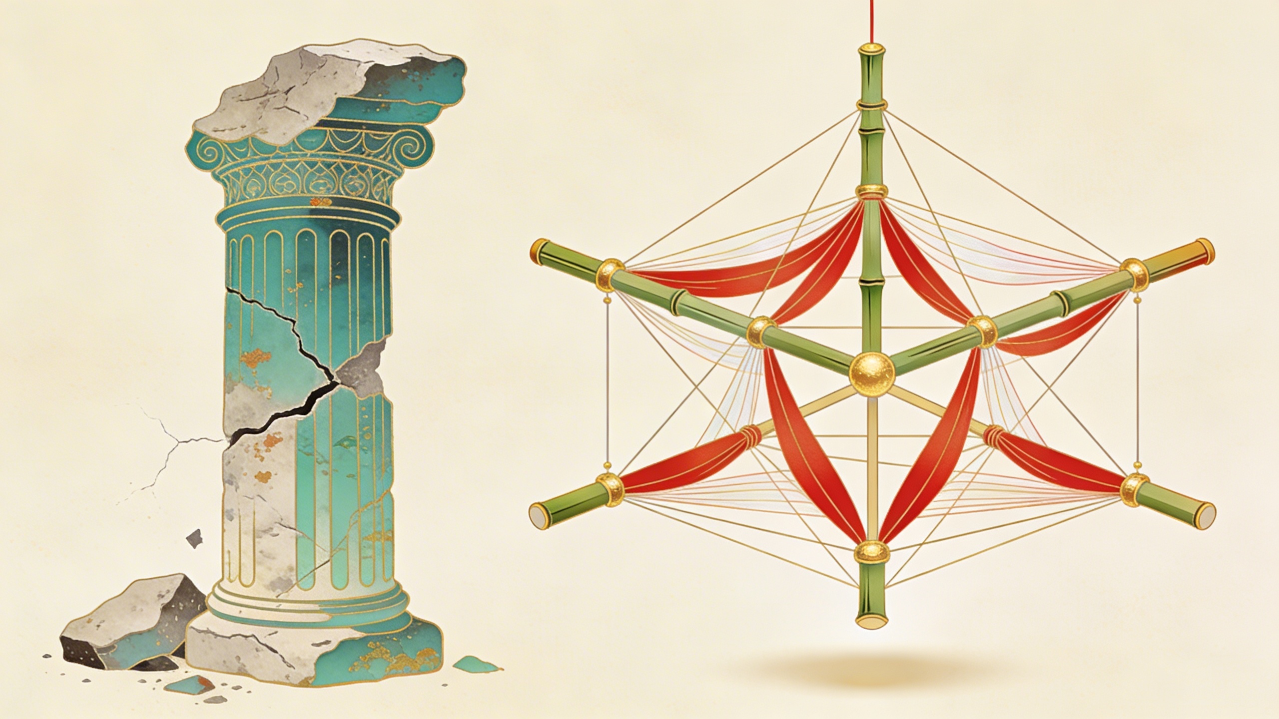Think of the difference between a stone column and a suspension bridge. The column bears weight through compression — each stone pushes down on the one below. Add enough stones and the column collapses. The suspension bridge bears weight through tension — the cables pull the deck up while gravity pulls it down, and the structure’s integrity lives in the dynamic balance between opposing forces.