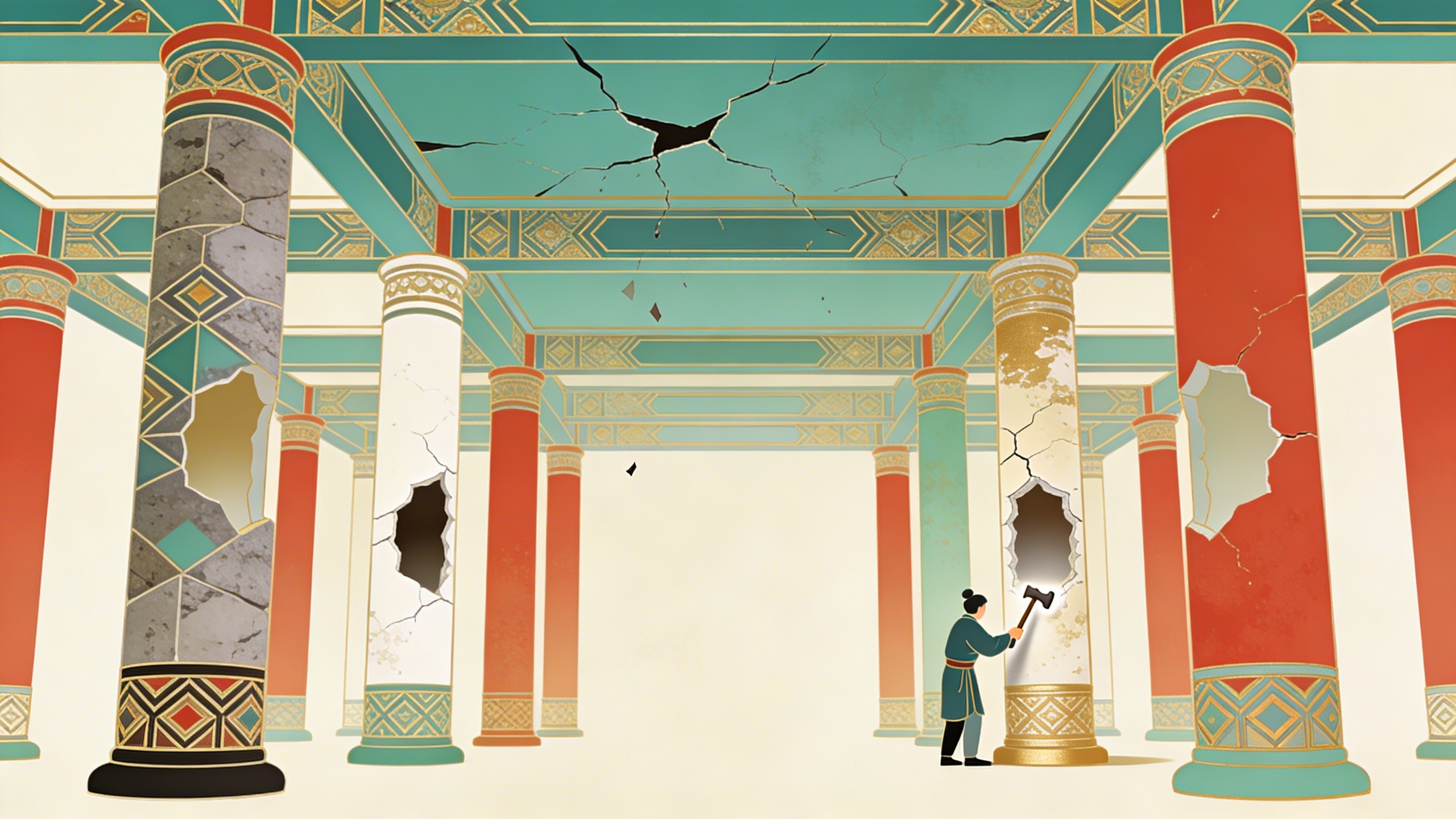 ELI5: imagine a building held up by columns. Some columns are solid stone. Others are hollow plaster — fake, but bearing real weight because everything around them leans on them. If you smash a hollow column to prove it is fake, the ceiling does not thank you for your honesty. It falls on your head. We each require a personal reality distortion field to live. Humor is what tempers it and makes it elastic — a person who takes himself seriously considers his personal reality the whole of reality.